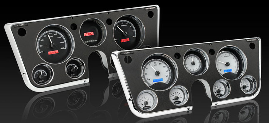 1967-72 GM pickups, Blazers and Suburbans have a simple dashboard which offers plenty of space for personalization. Making use of a seven-hole instrument bezel, this system that boasts six analog instruments, along with a third LCD message center (PU) or analog clock (PA) above the column. Stock turn signals have been upgraded with LED technology, and the whole operation utilizes a stock or reproduction bezel, available separately.